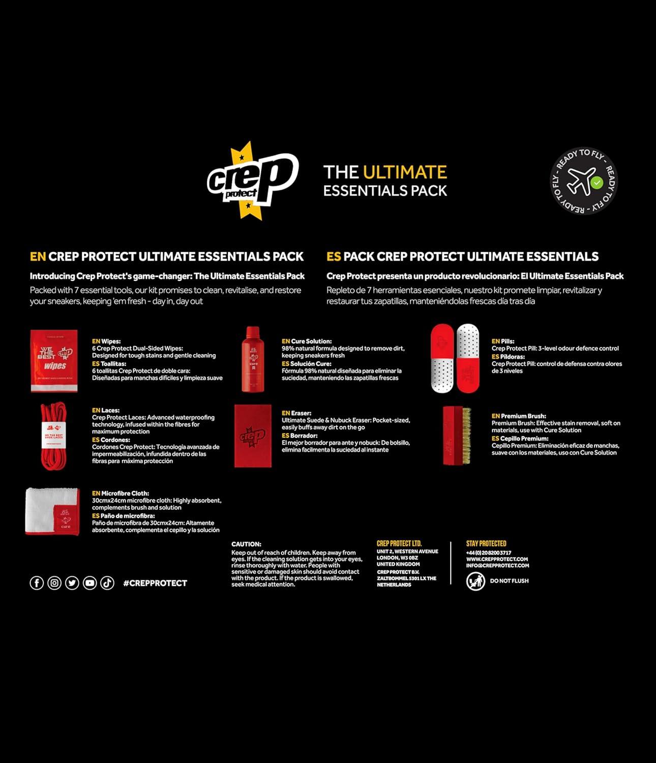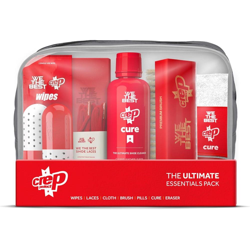 The Crep Protect Ultimate Essentials Pack is your all-in-one solution for keeping sneakers clean and fresh. This kit includes a 100ml / 3.5oz Cure Cleaner, a premium shoe brush, a portable suede eraser, and Crep Protect wipes for quick, on-the-go cleaning. Use the Crep Mark On to restore midsoles and the Crep Protect Pill to keep your shoes smelling fresh. Perfect for sneakers, leather, and suede, this comprehensive kit ensures your footwear stays in top condition every day.